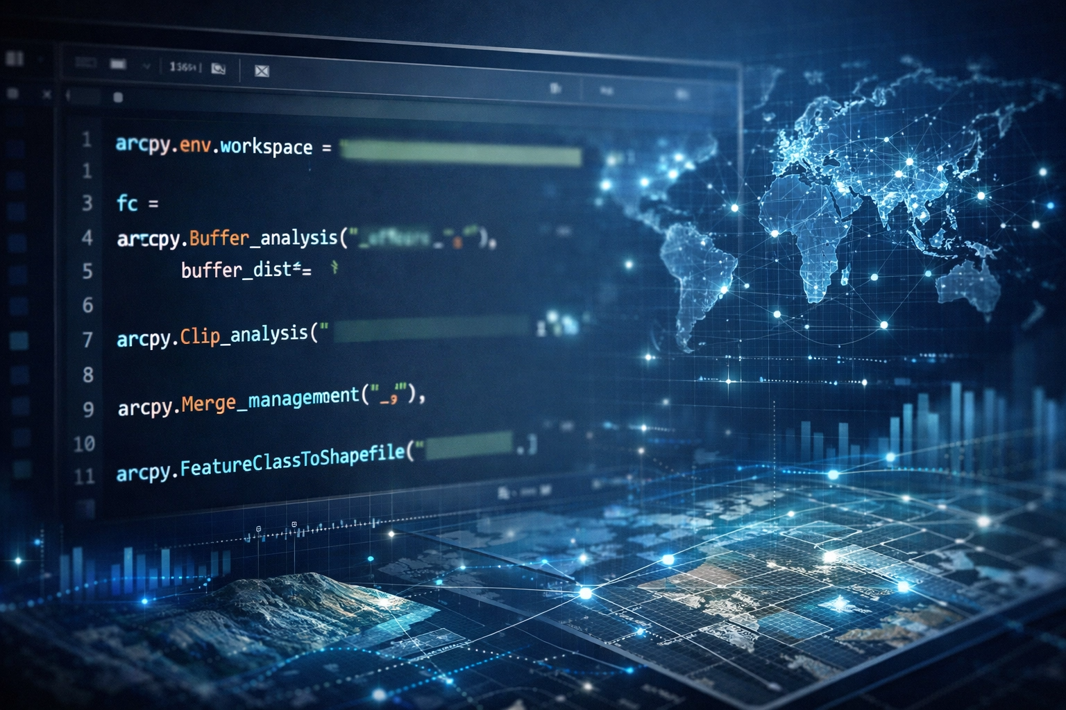Para necessidades mais complexas ou integrações específicas, desenvolvemos scripts personalizados utilizando Python e a biblioteca ArcPy. Com essa abordagem, oferecemos: